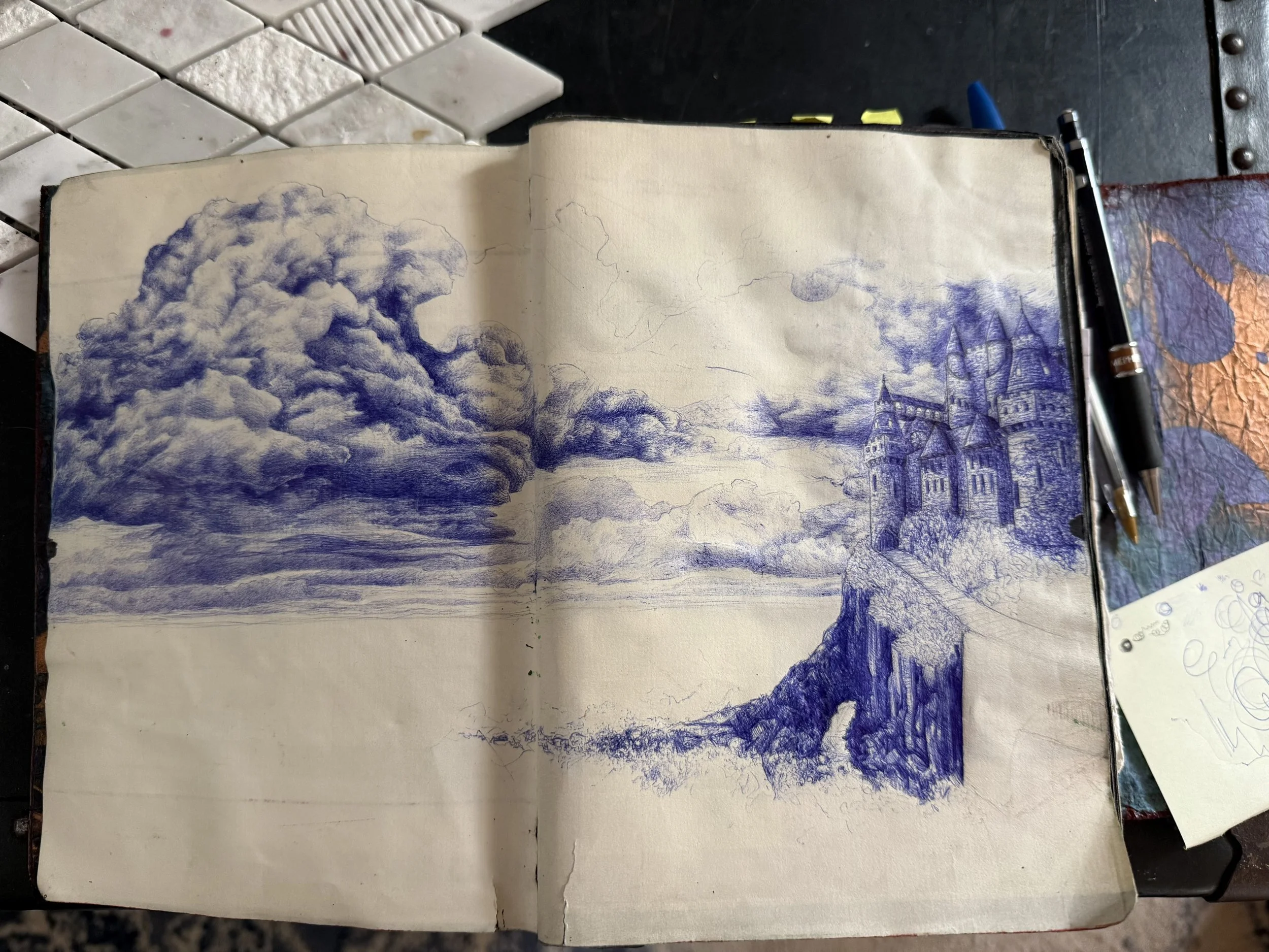 I have plenty of starts of sketches that, for whatever reason I just never got back to…. Maybe it was a technique that takes a long time regardless of enjoyment, or I had a lot of ideas I wanted to put down so I just threw down the basic idea and left it at that. During Spring Break I would like to return to some of those and bring the ideas closer to finality…. And of course start some new things. Here’s the one I chose for today. I e already done quite a bit of work on it. Unfortunately I forgot to take a picture when I started, but it was basically that one big cloud and the outline with some shading and texture on part of the castle and rocks.